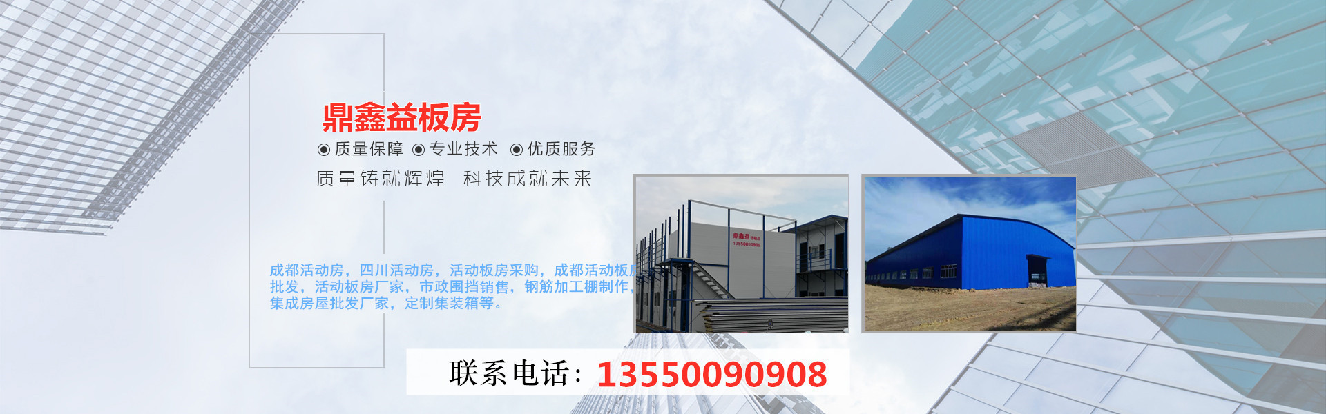 成都鼎鑫益活动板房有限公司,是一家集活动房屋的生产、租赁、拆装为一体的专业厂家。公司的定型产品是以夹芯板为墙体材料、以标准模数进行空间组合;构建采用螺栓连接,是全新概念的环保型、经济型的活动房屋;可方便快捷地进行组装拆卸,实现了临时房屋建筑的通用化、系统化、配套化供应,树立了环保节能、快捷高效的建筑理念,使临建房屋成为一个集成化生产、配套化供应、可库存和多次周围使用的定型产品。 本公司积极响应国家节能环保政策,不断引进先进技术及设备,拥有众多的...